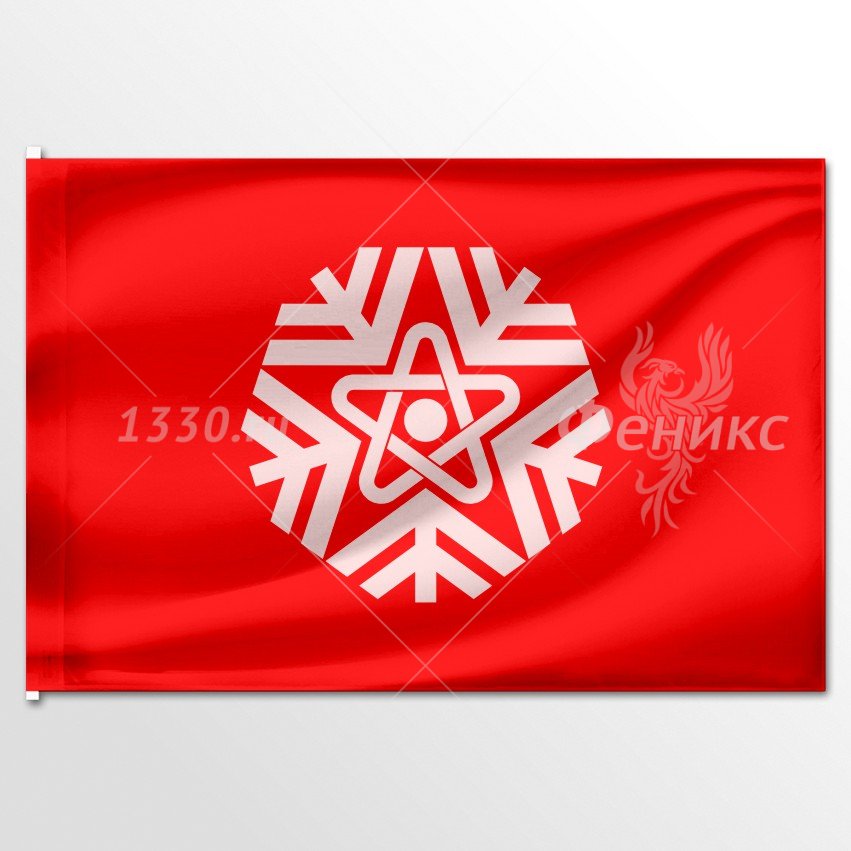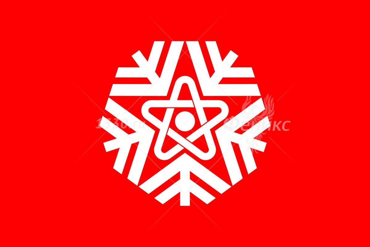 Флаг Снежинского городского округа представляет собой красное прямоугольное полотнище с соотношением ширины к длине 2:3, воспроизводящее в центре белые фигуры из герба города — плетёную пентаграмму со скрученными концами, сопровождаемую в середине кругом, а вокруг — пятью (двумя, двумя и одной) расходящимися лапами лиственницы.
