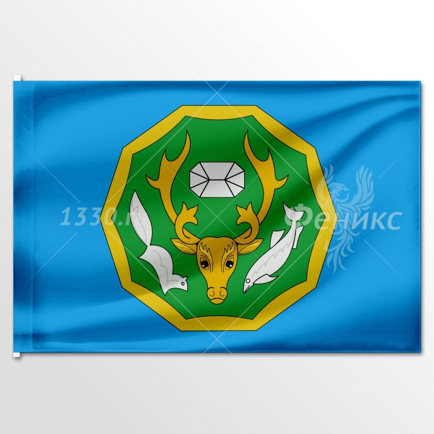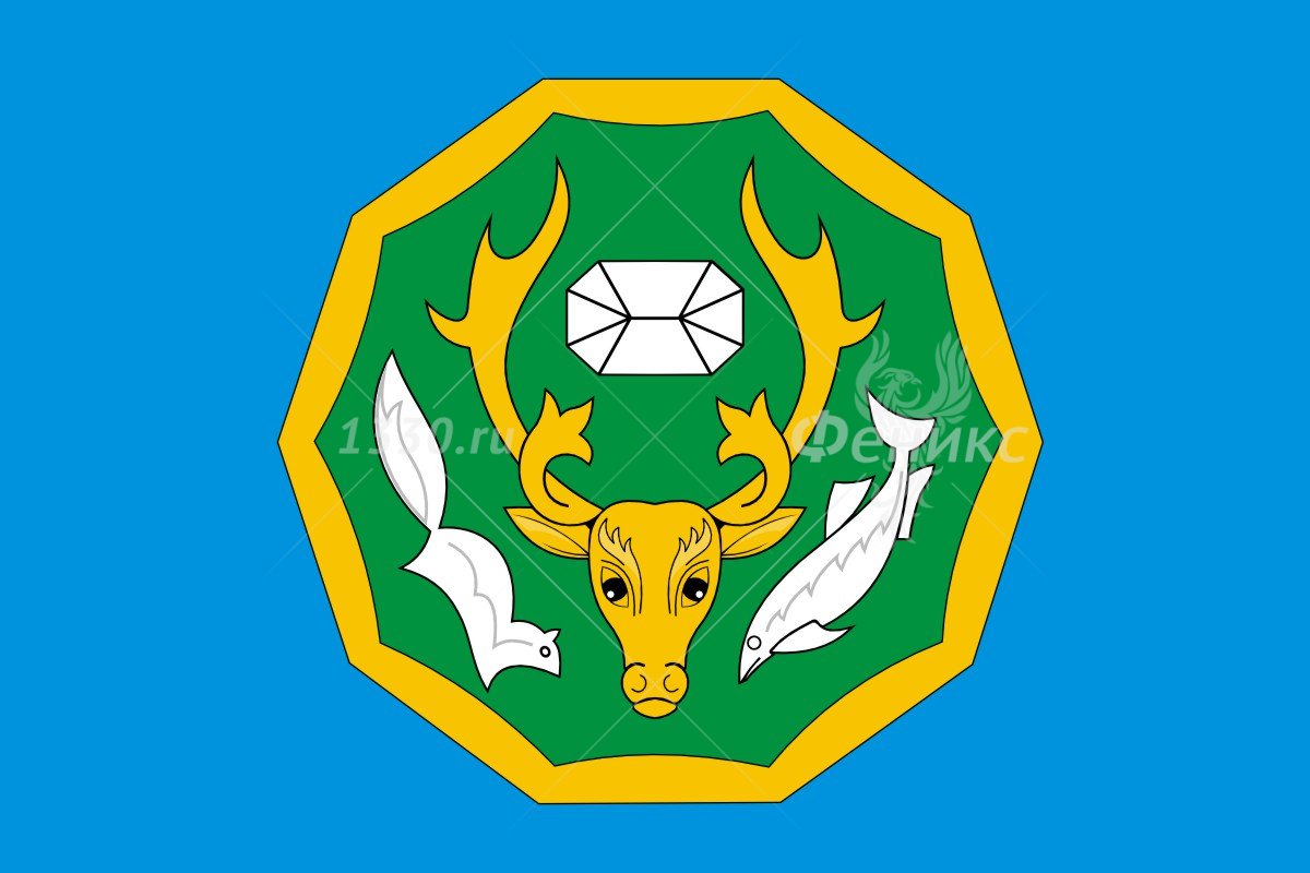 Флаг муниципального образования Приуральский район (вариант 1) представляет собой голубое полотнище с отношением ширины к длине 2:3, несущее изображение фигур герба муниципального образования.Геральдическое описание герба гласит: «В лазоревом (голубом, синем) поле золотой десятиугольный диск двумя углами вверх, обременённый таким же, но с вогнутыми сторонами, зелёным диском, в котором золотая голова оленя, изображённая прямо, сопровождаемая вверху серебряным с усечёнными углами бруском, а по бокам серебряными песцом и рыбой, опрокинутыми в стропило».